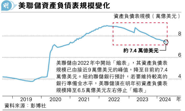 當美聯儲持有的債務減少,就需由投資者吸收,因此「縮表」會為債券孳息率帶來上行壓力,而結束QT可帶來放寬政策的效果。紐約聯儲銀行在美聯儲3月會議前訪問的主要銀行預期,美聯儲將於明年2月結束QT,屆時美聯儲的資產負債表規模將降至6.25萬億美元左右。