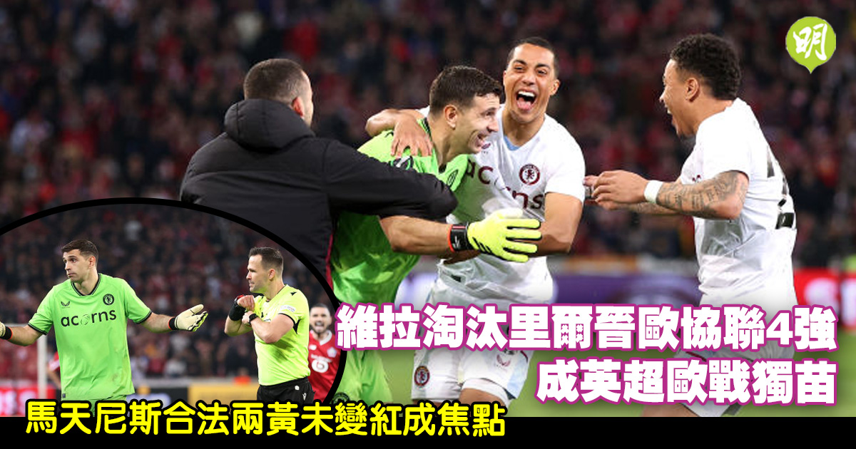 英超「四哥」阿士東維拉今晨(19日)於歐協聯8強次回合,作客1:2不敵法甲的里爾,總比數踢成3:3,最終戰至互射12碼階段憑門將達米安馬天尼斯兩次關鍵撲救,險勝4:3晉級,成為今季唯一躋身歐洲賽4強的英超球隊。