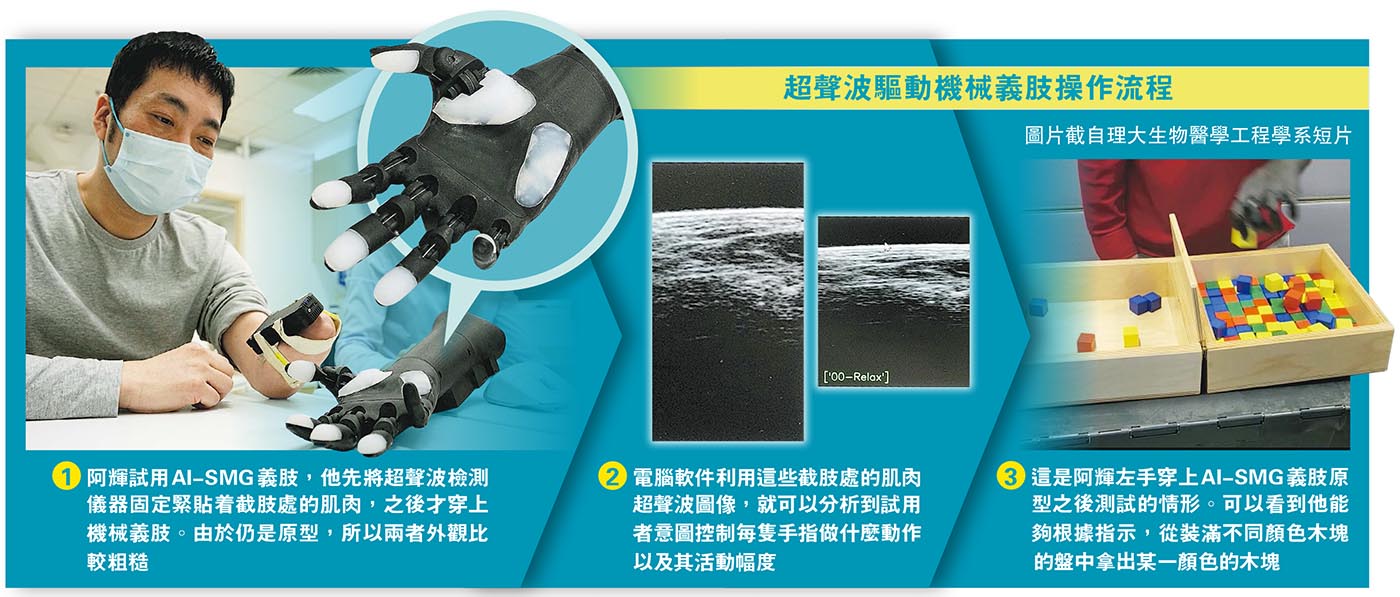 【明報專訊】現時主流的機械義肢是由肌電波(EMG)驅動,能賦與截肢者一定活動能力。但若應用於手掌,仍無法做一些精細動作。理工大學有團隊提出另一種技術方案,使用超聲波偵測肌肉成像,好處是可以判斷截肢者意圖控制不同手指動作和活動的幅度,從而反映在義肢上,而且反應時間短得多。