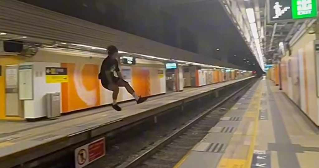 Instagram上載有一條名為「JUMPING MTR GAP」的片段,顯示一名男子在助跑後從火炭站的一邊月台跳起,越過路軌後在另一邊月台落地。片段亦有第一身視角拍攝,顯示疑有另一男子協助拍攝。片段所見,後方另一路軌有列車駛過。用戶在帖文標籤「#parkour(飛躍道)」等字眼,其帳戶早前有多段極限運動的片段,包括爬上天秤等,現已無法閱覽。
