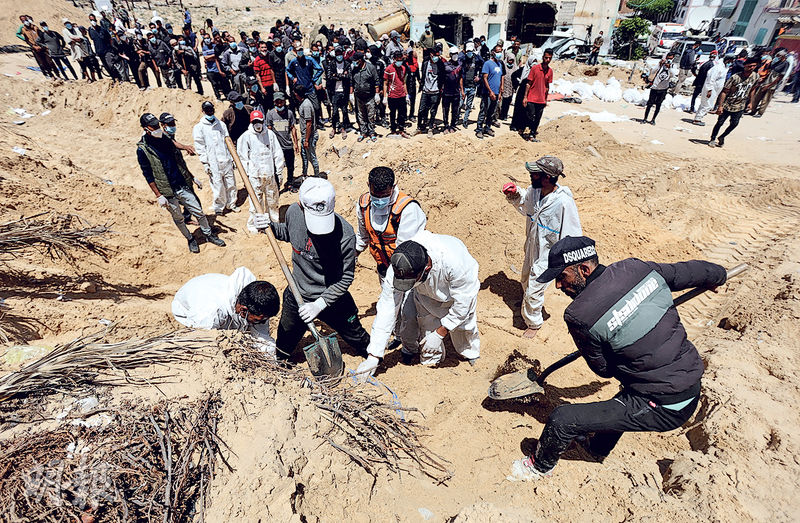 【明報專訊】以色列軍隊本月早些時候撤出加沙南部後,加沙民防部門人員周一表示,在汗尤尼斯(Khan Yunis)納賽爾醫院(Nasser Hospital)發現亂葬崗,已發現310具屍體。民防部負責人蘇萊曼周二聲稱,一些屍體手腳被綁,有被處決迹象,「我們不知道他們是被活埋還是處決。大多數屍體已經腐爛」。以色列國防軍周二表示,任何聲稱以軍埋葬巴勒斯坦人屍體的說法都是毫無根據,但表示曾挖出屍體檢驗,試圖尋找被哈馬斯擄走的人質,之後已將屍體放回原來埋葬地方。