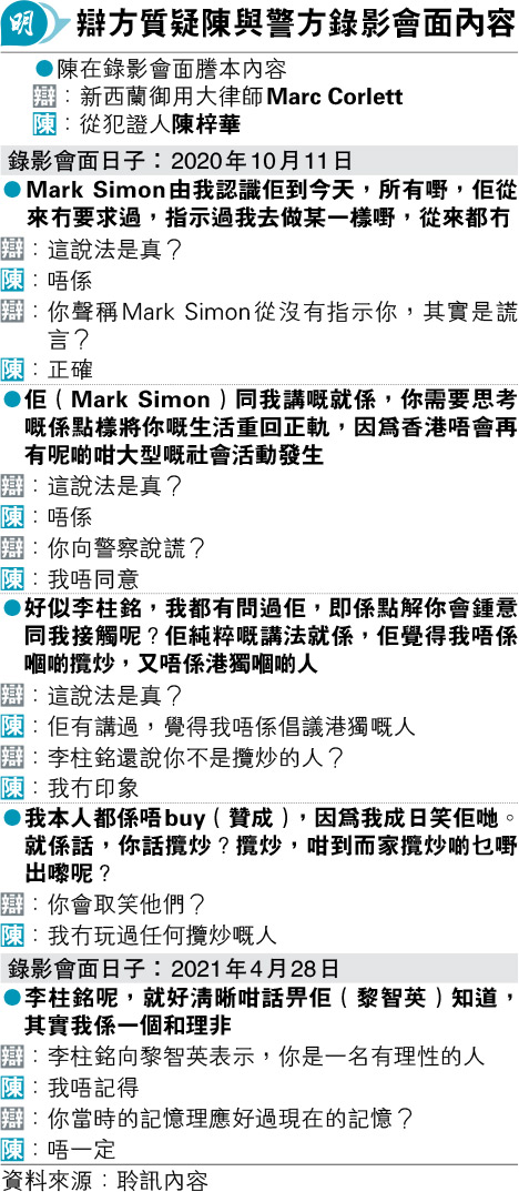 陳梓華日前供稱,黎智英和李宇軒2020年8月首次被捕後,黎助手Mark Simon稱仍有其他方法繼續推動制裁,着他不用擔心。辯方向陳梓華展示他2020年10月11日首次被捕後會見警方的供辭謄本(見表),當時陳尚未同意與警方合作。陳於會面稱Simon從沒要求或指示他做任何一件事,陳昨稱並非真正說法,承認當時向警方撒謊。