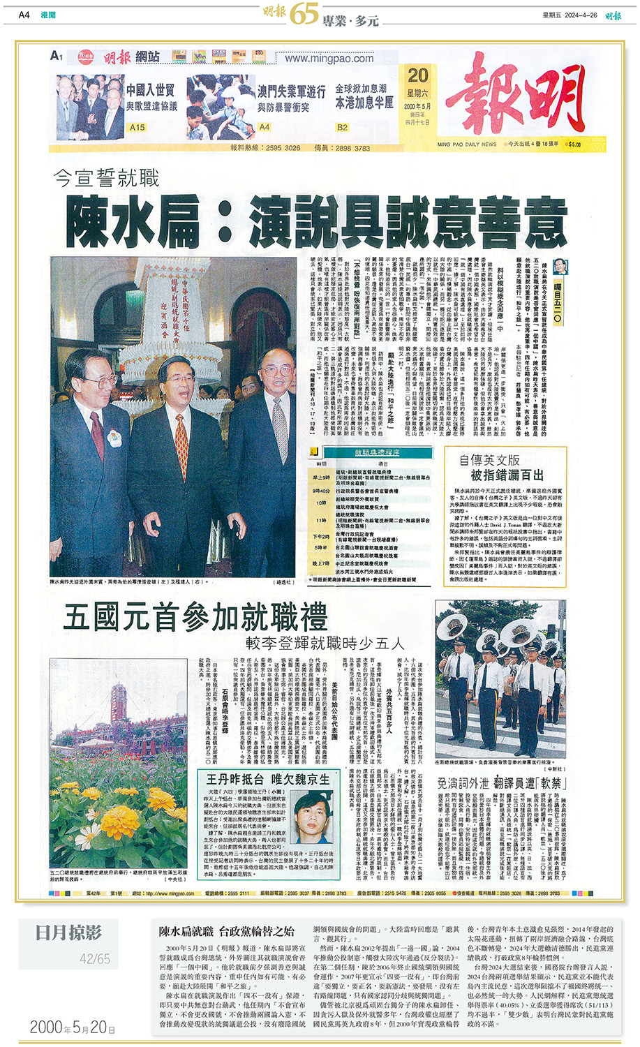 2000年5月20日:陳水扁就職 台政黨輪替之始