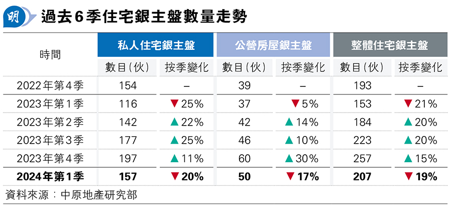 中原研究部高級聯席董事楊明儀指出,截至3月,住宅銀主盤存量共207個,比對上一季減少19%,公私住宅均下跌,其中私宅存量於3月底共有157個,按季減少約20%;公營房屋則有50個,按季少17%,私樓銀主盤數目減幅較公營房屋略高。
