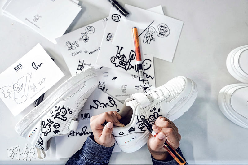 今年9歲的Andre雖然年紀輕輕,卻於不少繪畫比賽中獲得佳績,已經有3年畫齡的他,6歲時開始創作一個名為Taloha的角色,這次的KIBO×Taloha聯乘系列,就是將Andre的黑白單線畫作印在運動鞋上,一個是印上密密麻麻Taloha的男女裝款,另一個則是印有一個表情招積的Taloha並飾以網布的童裝款。在聯乘新品發布當日,看見Taloha像是擁有一條鋸齒尾巴的恐龍,問起Andre這個造型的創作靈感。「Taloha不是恐龍,他與家人住在Taloha Planet的Taloha Tower……」Andre一邊說一邊畫着圖畫解釋,完全不費力又流暢地畫了好幾張,創作能力甚高,之後他又專心為發布日的來賓(主要是一眾小朋友)「客製」親筆畫的運動鞋。Natalie替他進一步講解Taloha這個角色:「Taloha是具有對抗邪惡和傳播善意力量的外星生物,他們每個都擁有獨特的能力和性格。我認為Taloha向社會傳達的正面信息,與品牌使命非常契合。我希望社會能透過孩子單純的眼睛看待世界,相信內在善良和人性的美好。」Andre充滿童真的畫作,加上KIBO採用蘋果榨汁農場的農業廢棄物製成的素皮革運動鞋,兩者的結合發放一種清新的正能量,而且系列的部分收益會捐贈給母親的抉擇,為有需要的家庭帶來希望,令這次聯乘變得更有意義。