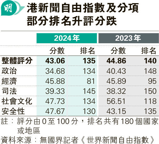 【明報專訊】昨日是世界新聞自由日,總部位於法國巴黎的無國界記者(RSF)公布最新世界新聞自由指數,香港全球排名止跌,由去年第140位升5位,在180個國家或地區排第135位,是連續兩年回升。不過,香港評分較去年再跌1.8分,至43.06分。