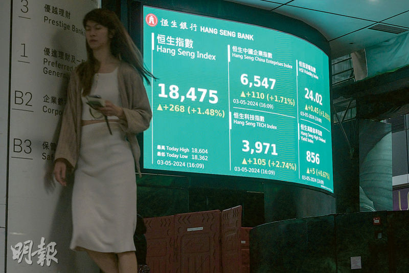 【明報專訊】受惠資金持續流入,帶動港股連升9日,恒指裂口高開逾300點,早段見18,604點全日高位後轉好淡爭持,收市報18,475點,升268點,見8個月高位,9日更累升2251點,累升約13.9%,創逾6年最長連升紀錄。科指升2.74%至3971點,創去年11月底後新高,國指收報6547點升1.7%,大市成交額1162億元,連錄10日逾1000億元,升勢由科技股擴至汽車及保險股。全周計,恒指累升824點,升幅4.7%,科指累升6.8%,國指累升約4.4%。分析員預期港股仍有上試高位空間,但息口走勢及內地經濟未見太大改變,挑戰20,000點有難度。