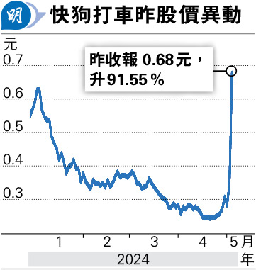 【明報專訊】資金風險胃納高漲,「超殘股」獲投資者追捧,尋找炒落後機會。繼商湯(0020)低位連日狂升後,另一隻科網股快狗打車(2246)昨日狂飈最多逾1.2倍,高見0.8元,為去年10月13日以來高位,收報0.68元,升91.5%(見圖),成為昨天升幅王,且見6個月收市新高,但是較2022年6月上市時招股價每股21.5元,累計仍然回落高達96.8%。