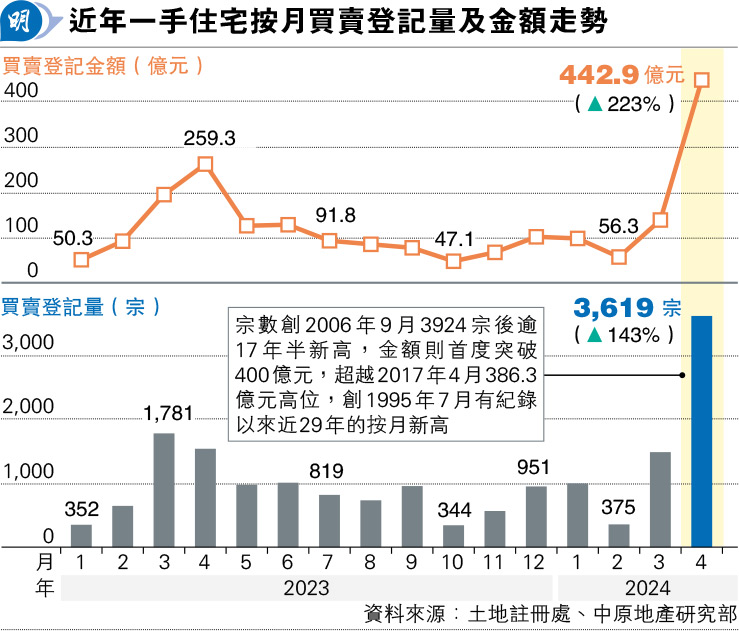 有關數字主要反映「撤辣」後首個月、即3月份樓市表現。中原地產研究部高級聯席董事楊明儀表示,「撤辣」後發展商加快推售新盤,而且開價克制,吸引用家及投資者入市,銷情熾熱,刺激一手登記飈升至逾3000宗高水平。她又指出,今年首4個月一手私人住宅登記錄6463宗,已達2023年全年10,682宗的六成,估計2024年全年一手買賣會擺脫2022年及2023年連續兩年僅約1萬宗的10年低水平。至於上月整體樓宇買賣合約登記(包括住宅、車位及工商舖物業)錄9880宗,總值839.35億元,較3月5013宗及373.71億元,分別急升97.1%及1.25倍。整體住宅樓宇買賣登記4月份共錄8551宗及774.56億元,較3月的3971宗及300.62億元,分別大升1.15倍及1.58倍,登記宗數創2012年10月8714宗後138個月、即約11年半新高,而金額創2021年7月786.04億元後的33個月、即近3年新高。