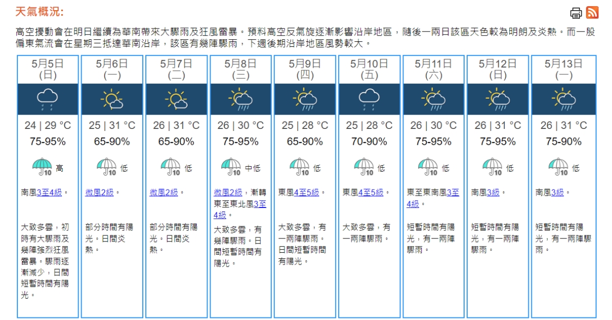 即時熱點 天氣|天文台料周日初時仍有大驟雨 日間短暫有陽光 (18:59) 發佈於 2 年 前 2024 年 5 月 4 日 By 明報 高空擾動正為珠江口一帶帶來大驟雨及狂風雷暴。天文台預測,本港地區今晚(4日)及明日(5日)大致多雲,初時有大驟雨及幾陣強烈狂風雷暴,明日驟雨逐漸減少,日間短暫時間有陽光。氣溫介乎24℃至29℃。吹和緩至清勁東風,明日轉吹和緩偏南風。展望隨後一兩日部分時間有陽光,日間炎熱。(天文台) 相關文章:天文台天氣天氣速遞 Up Next 日月掠影系列|2009年5月20日的《明報》 (10:45) 不要錯過 聯合國料加沙重建或要80年【多圖】 (12:14) 繼續閱讀 贊助商 猜你喜歡 天氣|天文台:日間部分時間有陽光 最高24°C (08:16) 下周急轉冷 市區最低13℃ 天文台:下周二顯著轉涼 下周三低見13°C (12:03) 天氣|天文台:短暫時間有陽光及乾燥 最高23°C (08:18) 天氣|天文台:周四日間部分時間有陽光及乾燥 市區最低20°C (21:16) 天文台:強烈東北季候風下周初抵華南 本港下周三低見16°C (12:10)