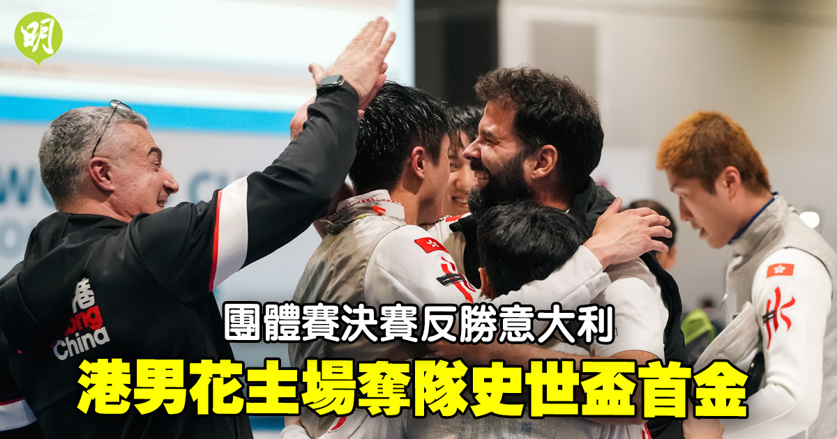 國際劍擊聯會(FIE)花劍世界盃香港站今(4日)假亞洲國際博覽館10號展館煞科,港隊在男花團體賽連挫匈牙利、法國和韓國隊,殺入決賽硬撼世界排名第2的意大利隊,最終以45:41反勝,奪得隊史世盃分站首金。