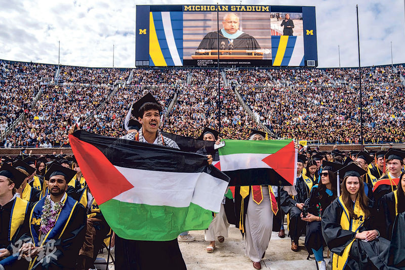 國際 美大學畢業禮撐巴示威 發佈於 2 年 前 2024 年 5 月 6 日 By 明報 【明報專訊】美國高校挺巴勒斯坦人示威持續,警方上周六(4日)對弗吉尼亞大學示威營區強硬清場,拘捕最少25名親巴人示威者。同日密歇根大學一場畢業禮遭穿戴阿拉伯頭巾或手持巴勒斯坦旗幟的親巴人學生「踩場」(圖),一度受到干擾。另外,紐約最少3間猶太教堂,以及布魯克林博物館上周六收到炸彈恐嚇,其中一間位於曼哈頓的猶太教堂一度疏散約250人,警方其後證實全屬虛報。 (法新社) (以色列-哈馬斯戰爭) 相關文章:以巴衝突以色列-哈馬斯戰爭學生示威密歇根大學巴勒斯坦弗吉尼亞大學紐約美國 Up Next 美暫停輸送彈藥 以政府高度關注 不要錯過 佛州辦籌款聚會 秘密「面試」副手 繼續閱讀 贊助商 猜你喜歡 特朗普簽署臨時撥款法案 結束聯邦政府43天停擺 (11:33) 美涉「法外處決」 英加停情報免成幫兇 以色列激進殖民者襲西岸巴人 衝擊以軍 民主黨人倒戈 美政府結束停擺入直路 參院展辯論表決程序 仍需眾院過關 美媒:經濟民生牌施壓民主黨奏效 特稱向國民派關稅分紅 財長:未必是錢
