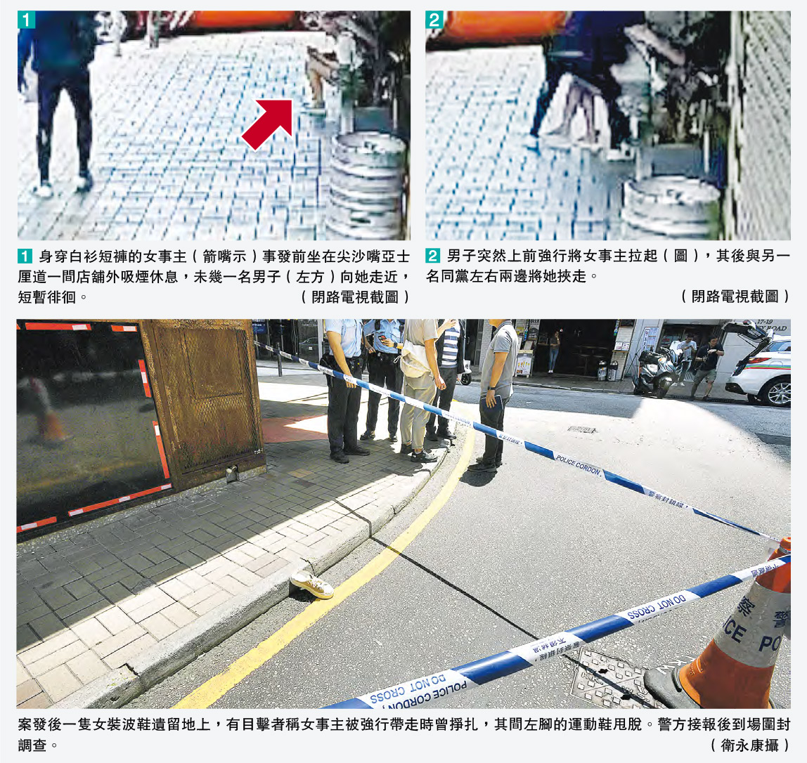 根據本報取得附近店舖的閉路電視片段所見,事發前有不少途人及車輛行經上址,身穿白色上衣及短褲的女事主當時坐在亞士厘道一間店舖外吸煙休息,未幾一名身穿深色衫褲及白色鞋的男子,由對開馬路走近事主,短暫徘徊後,突然邁步上前強行將她拉起,再與另一名同黨左右兩邊將事主迅速挾走,向宜昌街方向逃去。