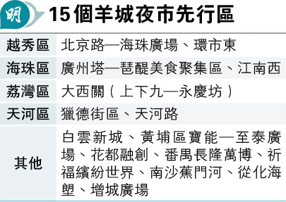 廣州市商務局相關負責人表示,當局將推行「包容審慎」監管政策,在已審批的羊城夜市先行區(見表),商業活動承辦者若申請於3個月內相同地點舉行相同主題的多場活動,預計人數在1000以上的,由公安機關一次過批核;1000人以下的,按季度向所在街道備案即可營辦。露天擺賣經營者可按年度向所在鎮、街道申請,指明擺賣區域和時段,同一年度毋須重複申請。在不影響市容環境和不違反法律法規的前提下,鼓勵製作有羊城夜市品牌特色的外景廣告和招牌。酒吧、餐廳、咖啡廳、文旅休閒類企業經營者若未開展歌舞遊藝娛樂業態,且不干擾居民正常生活秩序,營業時間不受現時的「凌晨兩點」限制,可自由延長。