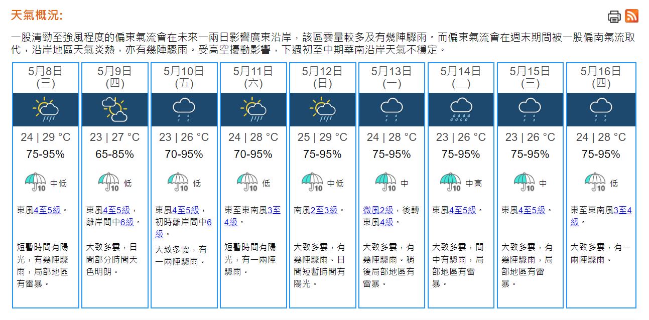 即時熱點 天氣|天文台:短暫陽光有幾陣驟雨 最高29°C (08:38) 發佈於 2 年 前 2024 年 5 月 8 日 By 明報 上午8時20分,天文台錄得26.0°C,相對濕度81%,驟雨及雷暴正影響珠江口一帶。同時,一股偏東氣流影響廣東沿岸。本港地區今日(8日)短暫時間有陽光,有幾陣驟雨,局部地區有雷暴。最高氣溫約29°C,吹和緩至清勁東風。展望未來一兩日風勢頗大,周六(11日)短暫時間有陽光,下周初天氣漸轉不穩定。(天文台) 相關文章:天文台天氣天氣速遞編輯推介 Up Next 「長洲太平清醮」特別郵票今發行 飄色、搶包山傳遞節慶氣氛 (16:05) 不要錯過 短片:租借可重用餐盒 市民未習慣 稱方便最緊要 (08:49) 繼續閱讀 贊助商 猜你喜歡 天氣|天文台:日間乾燥溫暖 最高25°C (08:14) 天氣|天文台:周三大致天晴乾燥 市區最低19°C (21:08) 天氣|天文台:大致天晴 最高23°C (08:14) 天氣|天文台:周二天晴乾燥 早上市區最低18°C (20:52) 天氣|天文台:有陽光及乾燥 日間最高20°C (08:17) 寒潮 | 廣州最低氣溫跌至1.7℃ (16:58)