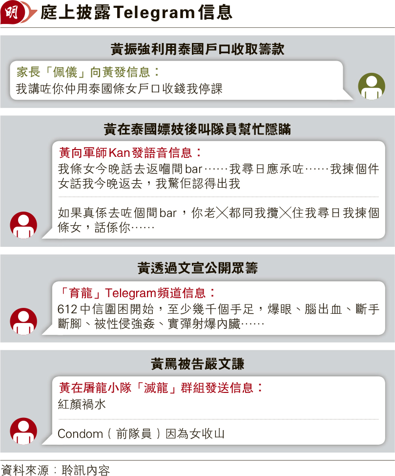 黃振強被問到於警方錄影會面時稱曾以「育龍」頻道發表信息「盡量煽情」、不理真假,他說當時認為向警方道出事實,但如今不記得為何這樣說。黃確認藉信息以獲得金錢,包括自己用來賭波嫖妓;他除和隊員到泰國旅行花上20萬元,另給隊員共20萬作減壓活動開支,惟無任何紀錄。審訊今續。