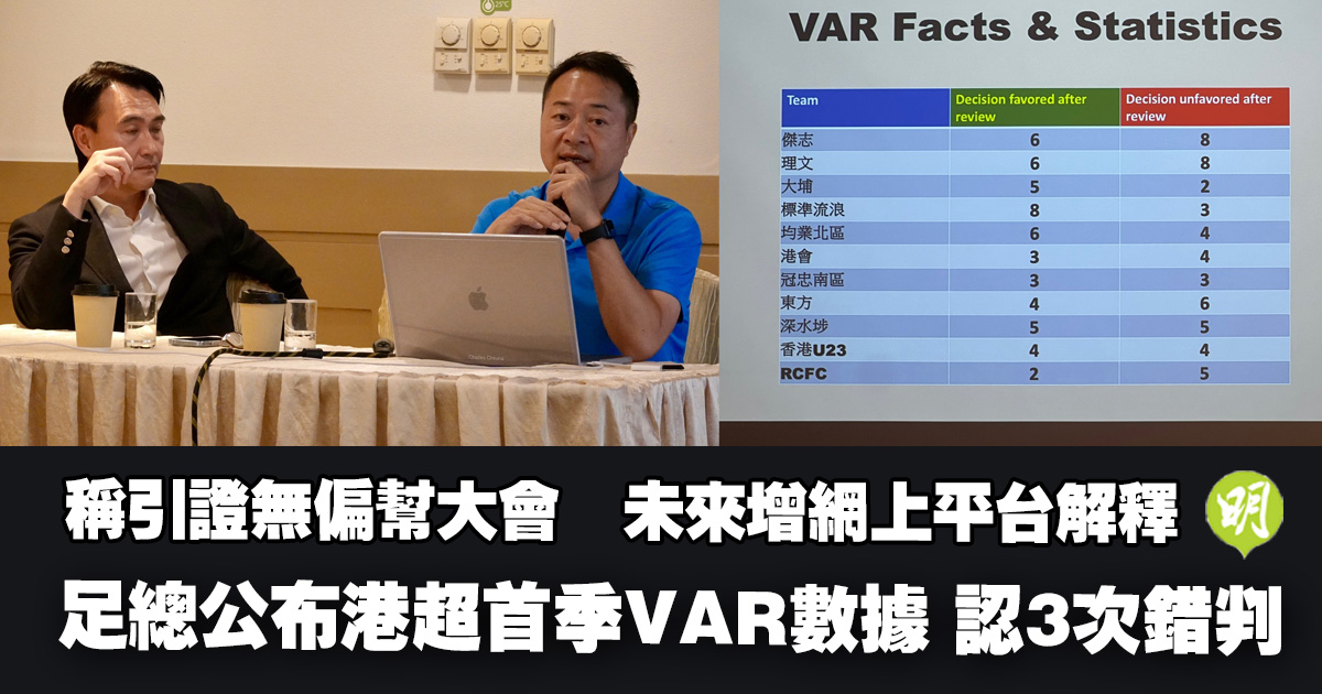 此外,足總裁判部提供了11隊港超VAR覆核次數,顯示各隊數字相若,如傑志和理文經覆核後有利及不利判決同樣分別為6次及8次,反而標準流浪獲最多8次有利判決,足總裁判部總監張炎有稱,數據反映未有偏幫「大會」。