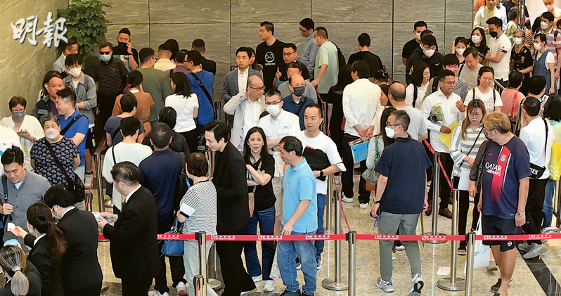 銷售分A、B兩組時段,A組買家需選購1個實用600方呎以上單位,最多購4伙;B組買家最多購兩伙。發展商安排A組買家在昨日早上10時到九龍站環球貿易廣場銷售處報到,現場人頭湧湧,買家眾多,排隊人龍由寫字樓3樓電梯大堂,延伸至商場及樓下停車場,買家連代理有數百人在場,場面熱鬧。