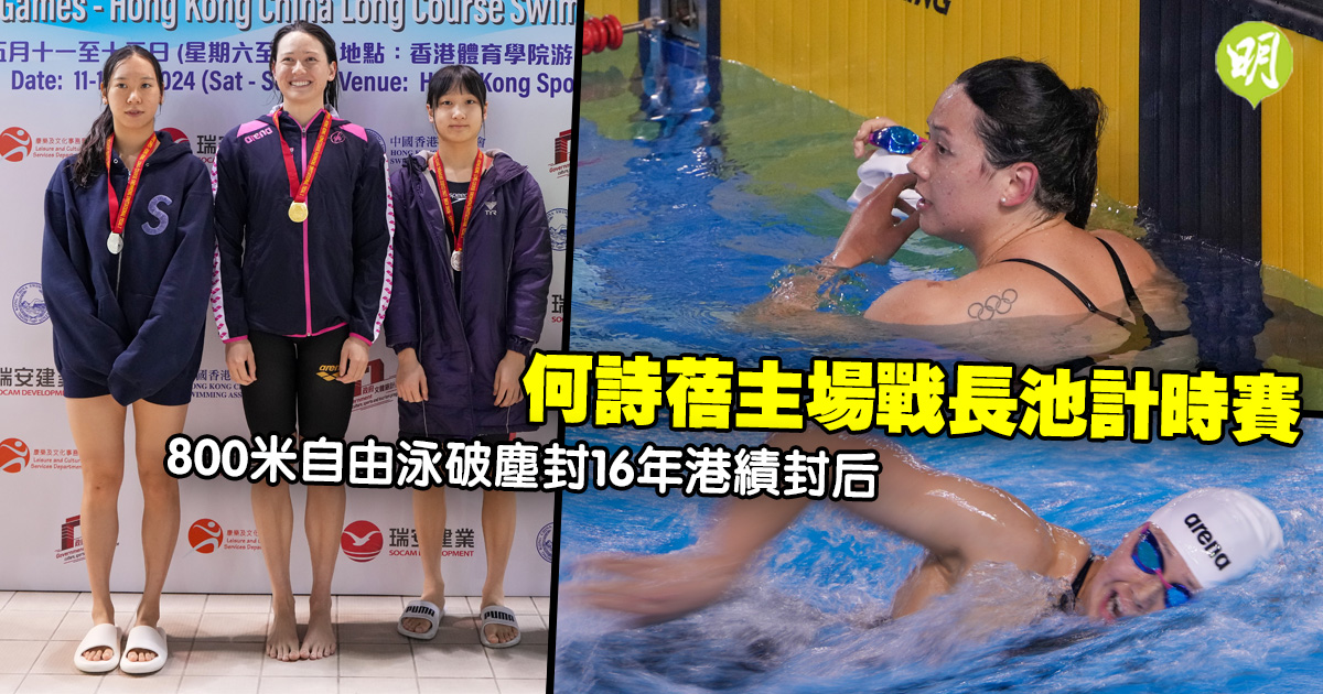 香港長池游泳計時賽作為巴黎奧運達標賽之一,吸引不少泳手參賽,港隊星將何詩蓓在女子800米自由泳決賽中,在首次轉池已遙遙領先,終以8分39.93秒強勢封后,並打破由歐鎧淳在2008年北京奧運造出的8分41.66秒舊港績。 何詩蓓目前包攬9個長池單項港績,在自由泳項目中,50、100、200、400及800米紀錄皆是其囊中物,只差1500米紀錄尚未到手。