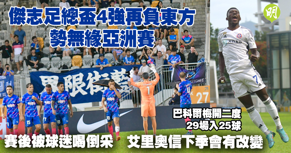 東方在今午(12日)香港足總盃4強,憑前鋒巴科爾梅開二度,在旺角大球場雨戰以2:1擊敗完場前有門將保羅領紅被逐的傑志,兩周內對壘「雙殺」之餘,更令宿敵衛冕失敗兼下季勢無緣亞洲賽。東方晉身決賽後,將於6月1日與深水埗爭冠。