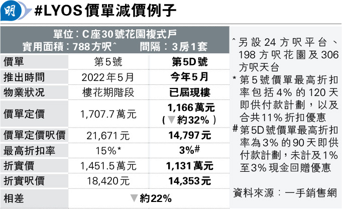 值得留意,上述單位定價1166萬元雖比2022年5月價單折讓最高32%,但由於兩次價單中可享優惠及價單定價有別,單位定價扣除兩張價單分別的最高折扣後,實際減價約22%(見表)。