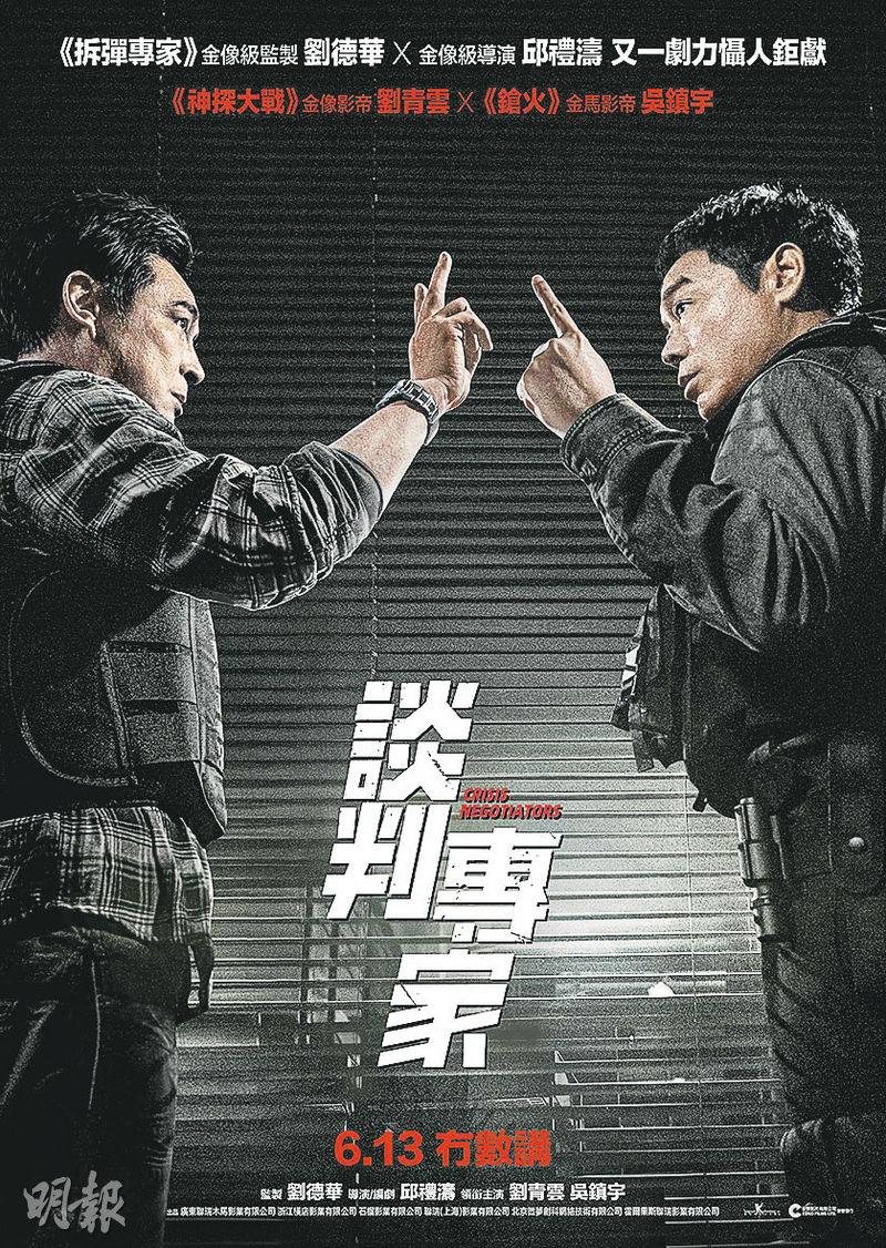 【明報專訊】劉德華監製,邱禮濤執導及編劇,劉青雲、吳鎮宇主演電影《談判專家》昨日發布最新海報及預告,宣布6月13日香港上映。兩大影帝劉青雲與吳鎮宇繼2005年《喜馬拉亞星》後相隔19年再合作,新片同演談判專家,一場警署挾持人質案,引發雙雄舌戰「講數」。海報中劉青雲與吳鎮宇身穿防彈衣,神情堅定,分別比出「一」與「二」的手勢,不僅暗示他們的角色地位,更預示一場關於心理和智力的較量即將拉開帷幕。