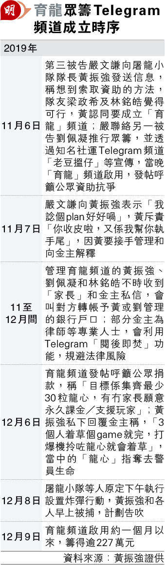 黃振強供述,第三被告嚴文謙2019年11月提議募捐眾籌,並推薦由劉佩凝管理頻道,促成「育龍」頻道成立(見表)。辯方展示信息指出,嚴事後「認叻」稱眾籌很安全,被黃夾帶粗言責罵。黃庭上解釋,嚴和隊友鹵莽推行眾籌,事後始告訴他,令他非常憤怒,他一邊忙於管理育龍,一邊向資助屠龍的「家長」和金主解釋,故出言斥責嚴。
