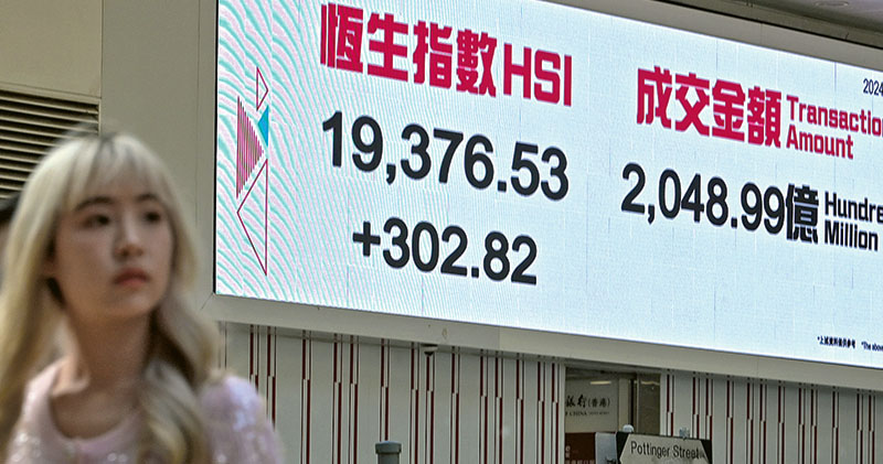 【明報專訊】美國減息預期升溫,騰訊控股(0700)業績佳獲大行唱好,一度升穿400元大關,加上中資金融股做好,恒指昨反彈逾300點,收報19,376點,再創逾9個月高位,成交金額急升至2049億元,為近年半以來最大成交金額,受內地政府擬出手買住宅物業消息刺激,內房股大升,阿里巴巴(9988)業績遜預期,逆市跌逾3%。