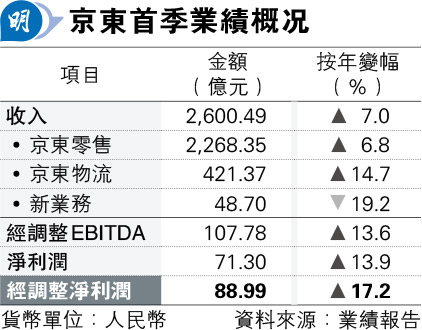 【明報專訊】京東(9618)今年首季收入及經調整純利均勝預期,期內收入按年升7%至2600.49億元(人民幣,下同),經調整純利88.99億元,按年增17.2%(見表),勝預期的74.12億元。集團管理層預期,今年整體表現將跑贏社會零售增長,加上積極建構平台生態,未來第三方訂單量將會超出自營業務。