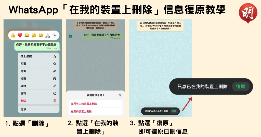 ⬤WhatsApp「在我的裝置上刪除」信息復原教學: