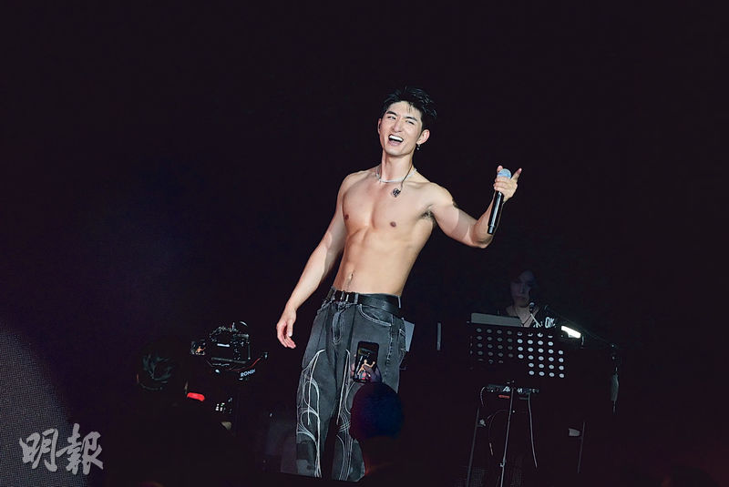 【明報專訊】無綫歌唱選秀節目《聲夢傳奇》的張馳豪(Aska)、潘靜文(Sherman)和林智樂(Felix)前晚於主題公園內舉行《音樂出沒First Jump》音樂會,Aska粉絲最多,部分指定門票觀眾,完騷後可跟他們拍照。3人分別獻唱許美靜《傾城》、衛蘭《離家出走》和陳奕迅《裙下之臣》為演唱會掀序幕。之後穿西裝的Aska打頭陣唱出多首歌後,除外套露背心曬麒麟,最後應歌迷要求除衫,赤膊騷肌唱歌,粉絲瘋狂尖叫,氣氛高漲。
