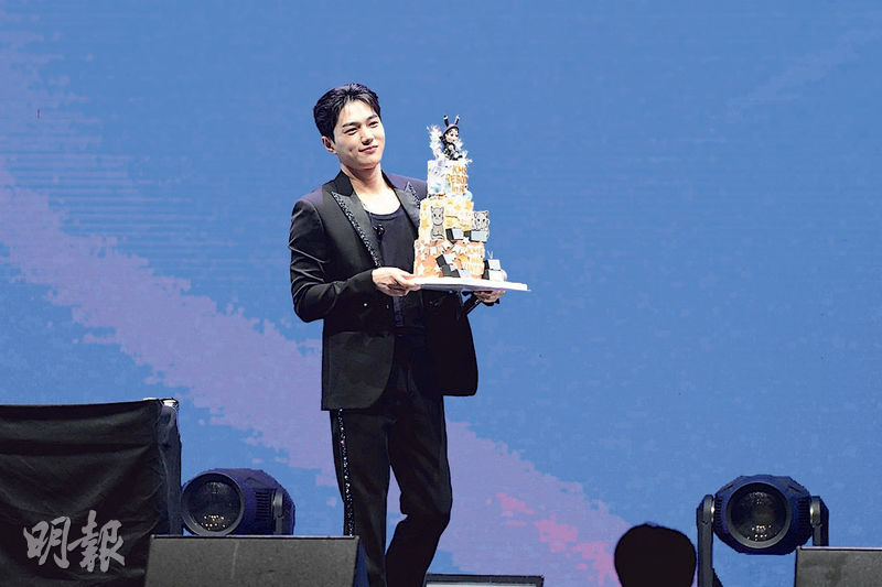 【明報專訊】韓國男團Infinite成員金明洙(L)前日在旺角麥花臣場館舉行香港粉絲見面會,他先高歌《Love U Like U》揭開序幕,中途用廣東話問:「有無掛住我?好掛住你哋!」台下粉絲隨即起哄。他自爆抵港即品嘗點心、蛋撻及雞蛋仔,並到中環「打卡」,完騷後繼續享用港式美食。明洙早前弄傷腳踝,演出當日仍用繃帶包紮,大部分時間坐着演出,自言因傷無法落台跟粉絲近距離接觸而抱歉,又自嘲年紀大,「因此愛吃暖胃的東西」。他透露正籌備個人專輯,但會先推出Infinite新碟,希望一年內再次來港開騷。