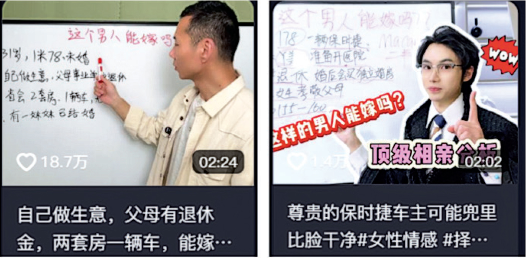 有多次相親經驗的北京王小姐,最近也在抖音上刷到影片。她表示,以她相親過幾十人的經驗來看,軍師講的「基本準確」。在相親市場中,媒人總是會美化對方條件,這其中身高虛報是最常見的,「報『180厘米以下』的,基本就是175左右」。她稱,很多相親年輕人都是「單身狗」,戀愛經驗不多,而媒人列的條件會隱瞞一些實情。可以理解這些短片為什麼火,但她只是當消遣看,因為其中難免部分有騙流量的情况,「還有奇葩的想出名」。
