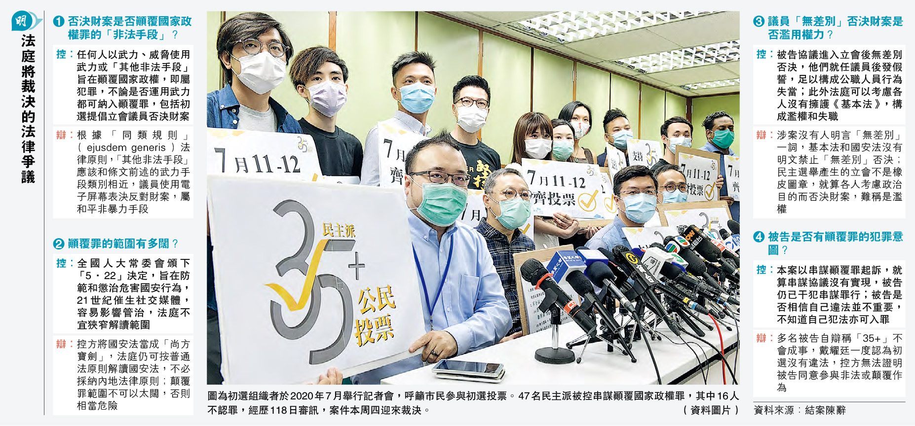 【明報專訊】最大規模《港區國安法》案件,「35+」初選案本周四(30日)起一連兩天裁決。不認罪的16名被告橫跨民主派不同政治光譜,國安法指定法官將宣判串謀顛覆國家政權罪成與否。本報整理過百日證供和法律爭議,若要裁定各人罪成,預料須認定他們有共識,協議「無差別」否決政府《財政預算案》;若他們未達一致共識,控方未能舉證被告參與其中,或因合理疑點而脫罪。