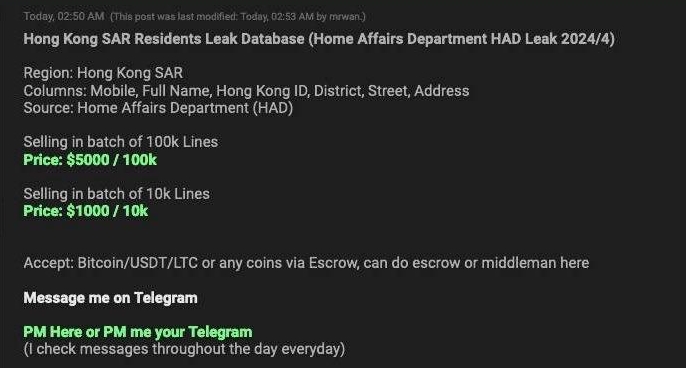 有黑客於暗網聲稱有售本港市民的個人資料,包括電話號碼、全名、身份證號碼、地址,並指資料由民政事務總署外泄。每一萬項資料售價1000美元,10萬項資料則售5000美元,要求用虛擬貨幣交易。民政事務總署今午(25日)表示留意到有人在網上平台出售聲稱屬於民政事務總署系統內取得的市民資料,澄清沒有資料外洩。