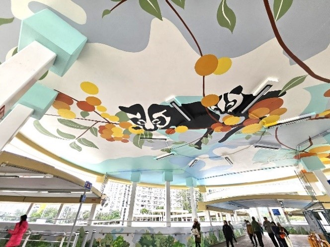 至於大圍港鐵站,路政署以「城市河道」為主題,在村南道行人路、有蓋行人通道、行人天橋、相關升降機及路燈燈柱等,以貼圖或繪畫方式美化,展現新界東部與吐露港相連河道沿岸常見的鷺鳥生態環境。大圍站另一邊,美田路/車公廟路行人天橋的通道及橋身則以「躍動郊野」為主題,展現香港野生動物圖案,包括果子狸和豹貓等。