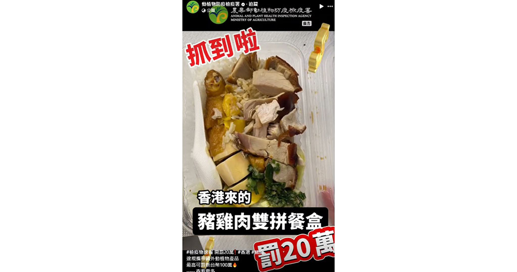 台灣農業部動植物防疫檢疫署桃園分署表示,近日從一名由香港飛抵台北的印尼籍遊客身上檢獲豬肉雞肉燒味雙拼餐盒,即場罰款20萬新台幣(約5萬港元),該名遊客因無法即場繳款遭遣返。