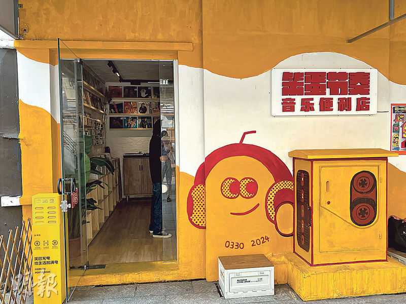 從碎布一條街走進曉西社區,就像廣州眾多的平民生活地,有街坊在樓下散步,靜謐優閒。不同的是,民居樓下開着自成一格的小店,有咖啡店、古著店、甜品店、手工藝品店、花店等,每間裝修獨特,色調不一。例如黃白色調外牆畫上戴耳機公仔的「音樂便利店」,主要售賣黑膠、CD和錄音帶。門外掛着兩隻「大眼」、寫上「take your time」等字句的「慢慢商店」,手袋、掛飾、筆、杯等應有盡有。主打「小眾哥特系」的古著店,黑紫色調盡顯獨特風格。一家經營大頭貼的店舖,門面呈紅蘋果形狀,猶如走進童話世界。也有衣飾店外牆是「日落橙色」,整齊放着幾排彩色的手工手袋、衣服、首飾,老闆娘說大多是她人手製作。