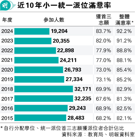 【明報專訊】今年9月升小的「統一派位」(俗稱大抽獎)下周三(6月5日)放榜。教育局昨公布,16083人在統一派位階段獲派首三志願,滿意率約83.7%,連同自行分配學位,整體滿意率達92.2%,兩者皆創回歸以來新高。津貼小學議會表示,適齡學童減少,滿意率不斷升高屬預料之內,促當局取消小一叩門位。