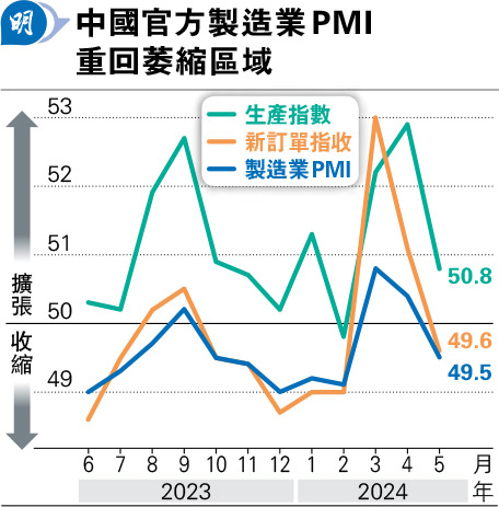 不過東亞銀行首席經濟師蔡永雄認為,內地經濟去年底至首季表現不錯,當局視乎經濟表現,至4月底和5月初才再推出股市、房地產等新一輪支持經濟措施,惟政策效果仍需時間體現,令5月PMI較4月呈然收縮,他認為純粹反映經濟復蘇的波動,而7月三中全會亦預期有後續支持措施,並不擔心之後內地經濟放緩。
