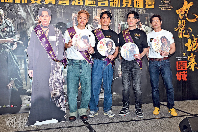 【明報專訊】林峯、劉俊謙、伍允龍與胡子彤主演電影《九龍城寨之圍城》港澳票房破9000萬元,連續32日單日票房冠軍。昨日4人攜同不在港的張文傑紙板出席在商場舉行的見面答謝會,與800粉絲玩遊戲,又送電影心意卡,吸引大批市民圍觀,過千人迫爆商場,眾人齊嗌口號,預祝票房破億元,場面墟冚。對於大批「老婆」爭見「老公」,人夫林峯即說班老婆是幾名拍檔的。對於女友蔡思韵稱不介意「一夫多妻」,劉俊謙開心有個大方女友。單身伍允龍開心終於有人叫他「老公」,3拍檔大讚他是筍盤,可為他公開招親。