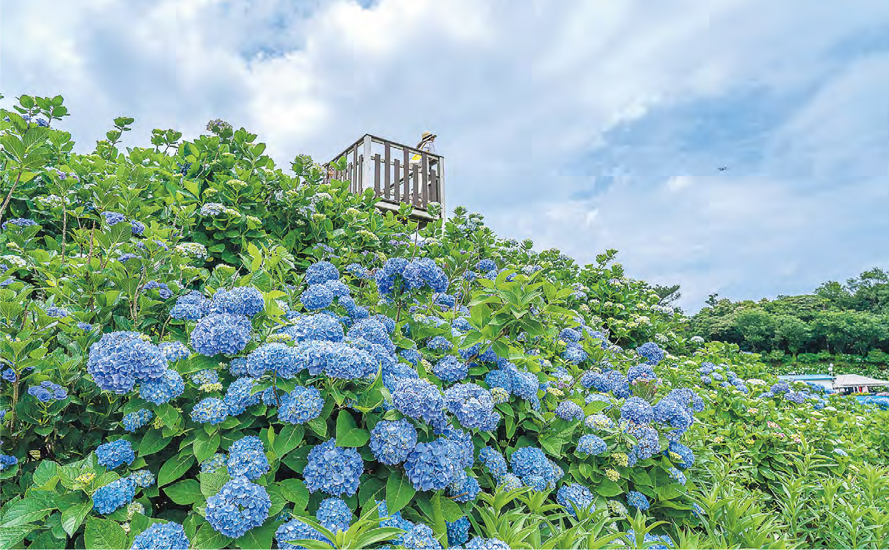 高家萬里園區採用梯田概念,規劃出3層繡球花田,從遠處便能看見一片由低至高、繁茂壯麗的花海。這片繡球花主要以水藍色為主調,層層延綿到山邊,令人彷彿置身於花的海洋,被一整片浪漫繡球花包圍。