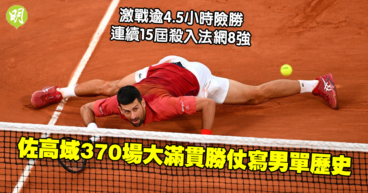 法國網球公開賽今晨(4日)續演16強賽事,世界一哥佐高域激戰超過4.5小時,以盤數3:2險勝23號種子的阿根廷籍好手謝倫杜洛,連續15屆法網躋身8強之餘,更取得職業生涯第370場大滿貫勝仗,超越名宿費達拿,寫下男單歷史新一頁。