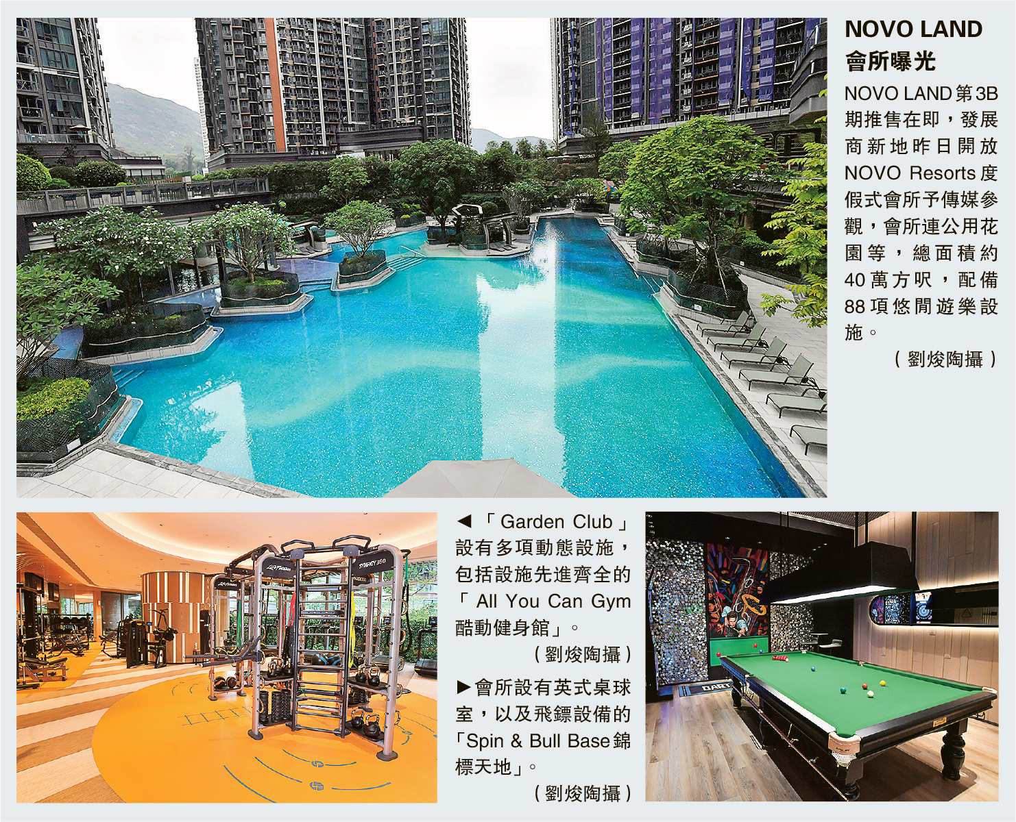 另新地向傳媒開放NOVO LAND住客會所部分設施;NOVO Resorts度假式會所、連公用花園等總面積約40萬方呎,由「Poolside Club」、「Garden Club」、「Skywalk」三部分組成,其中「Poolside Club」大部分設施早前已開放,主要設施包括25米室內恆溫「Shimmery Pool 極光星池」。