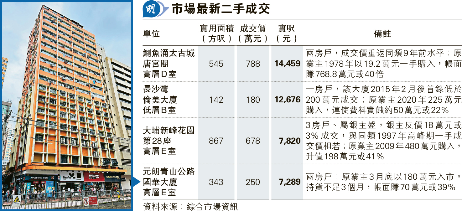 另一方面,樓齡約40年的長沙灣單幢樓倫美大廈,則錄蝕讓。資料顯示,該大廈低層B室,實用面積142方呎,原則屬一房戶,上月以180萬元易手、實呎12,676元,為該大廈2015年2月後,首次再有單位成交價低於200萬元。