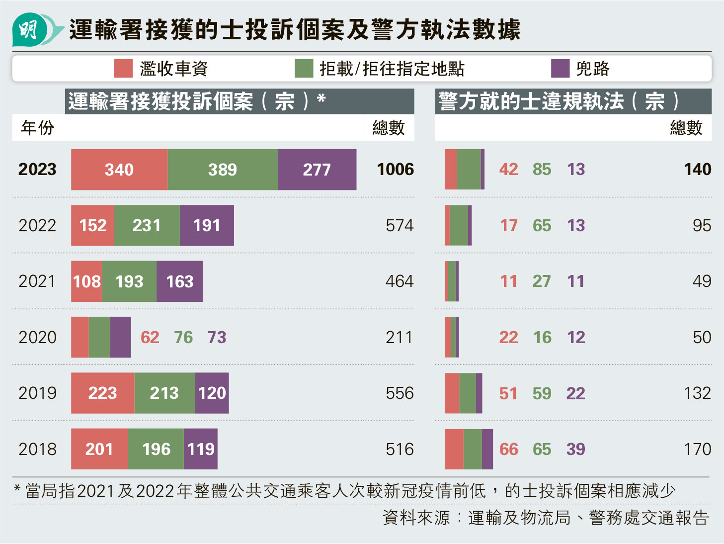 【明報專訊】違規的士投訴增加。運輸署過去3年接獲有關濫收車資、拒載或「兜路」等性質較嚴重之的士司機投訴個案持續增加,由2021年464宗倍增至去年1006宗,去年數字亦較2022年升約75%,亦較2019及2018年多近一倍。警方去年就相關的士司機違規事項執法共140次,亦是過去3年最高(見圖)。