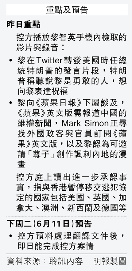 【明報專訊】壹傳媒創辦人黎智英及《蘋果日報》3間相關公司涉串謀勾結外國勢力案,昨第89日審訊。控方續播放在黎智英手機內檢取的片段及錄音,當中黎向《蘋果》員工談論編採事宜,稱《蘋果》英文版要報道更多中國的維權新聞。控方播畢所有片段及錄音後,預計多一個審訊日便能完成控方案情。黎一方稱,將就本案控罪有否表證成立而作中段陳辭。法官下令將案件押後至6月11日(下周二),待控方完成案情,並定於7月9日中段陳辭。