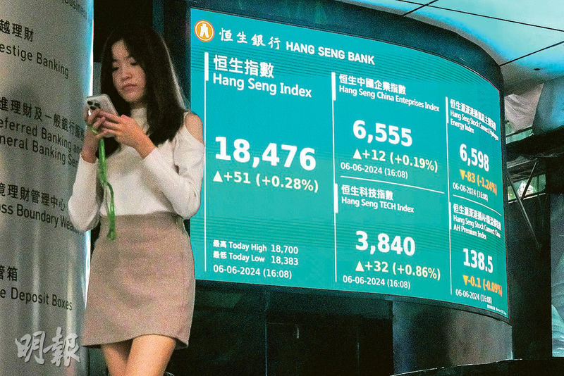 外圍科技股表現理想,科指收報3840點,上升0.86%跑贏大市。Nvidia(美:NVDA)公布與鴻海建立先進計算中心,帶動同系港股急升,鴻騰(6088)升18.26%,富智康(2038)升7.79%。蘋果(美:AAPL)年度開發者大會下周舉行,手機設備股偷步炒上,丘鈦科技(1478)和瑞聲科技(2018)升逾7%。紅海局勢續推升航運價格,中遠海控(1919)與東方海外(0316)續升4.29%和2.12%。上周末以來,恒指維持在18,200點至18,700點區間,資深分析員熊麗萍指近日港股皆高開低收,反映市場較為審慎,今日美國公布非農就業數據,且美國近期經濟數據轉弱,市場觀望月中美國議息取向會否較為偏鴿。另外中證監早前表示會在19日舉行的陸家嘴論公布資本市場相關政策,投資者亦關注政策是否偏向放寬。她認為現時基本市况仍然良好,若近日數據理想,恒指下周可望挑戰萬九點。
