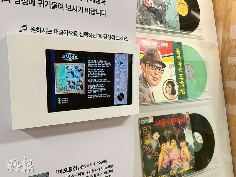 點唱機剛好播放女歌手惠恩1979年作品《第三漢江橋》,此曲發行時大受歡迎,及後一直被翻唱。歌詞提到「江水在流淌/在第三漢江橋下/承載着你和我的夢想/承載着我的心」,橫跨漢江的漢南大橋為人熟悉,原來第三座漢江大橋為其舊稱,故此曲反映首爾地區特色。展廳展出另一黑膠唱片《首爾的女孩》,由新世紀唱片公司1964年發行。那是韓國工業化時期,女性更積極投身社會,《首爾的女孩》描繪女性時尚聰明的形象,是展現某時代首爾的代表歌曲。