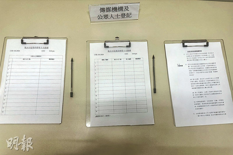 北區鳳水分區會上周四召開第二次會議,該會提供傳媒與公眾填寫的兩款登記表格,傳媒需填寫代表機構與員工編號,旁聽者需先閱覽會議常規才可進內,內容包括旁聽會議規定,如列明座位先到先得。